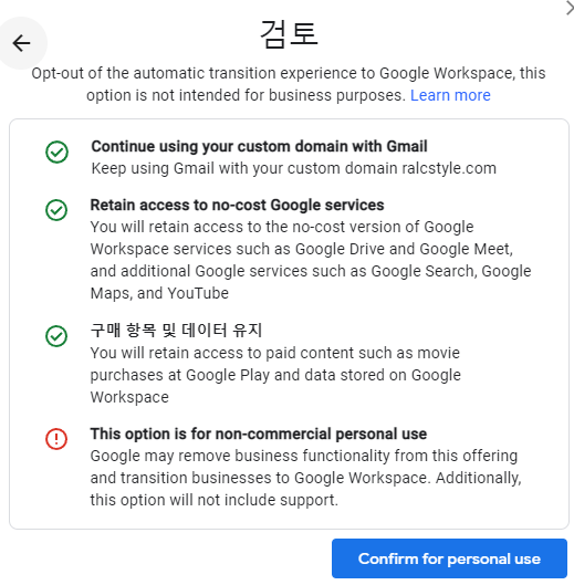 그동안의 Gmail 메일함 자료나 Google Play 스토어 구매내역 때문에 유료 전환을 생각중이었는데, 다행히 최근 개인 용도의 사용자의 경우 유료 Google Workspace로의 전환을 거부하고 무료로 계속 사용할 수 있는 no-cost Legacy G Suite 옵션이 생겼습니다.