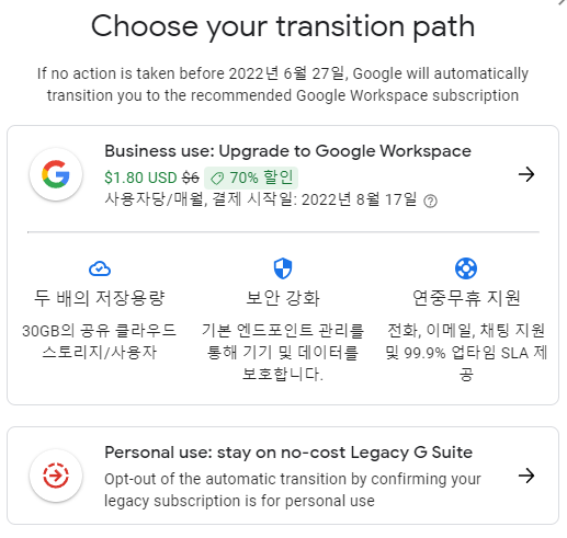 기존 G Suite 무료 버전의 Google Workspace로의 전환 거부 (무료 유지) 및 유료 구독에 관한 자세한 내용은 아래 링크를 참조하시기 바랍니다.